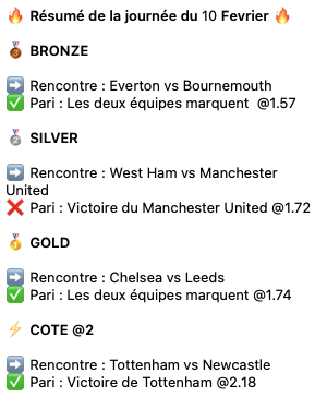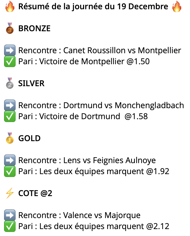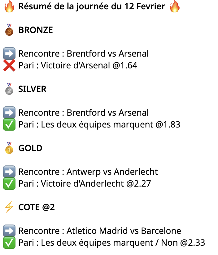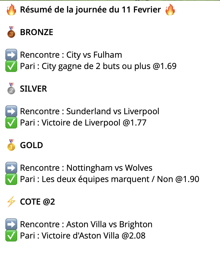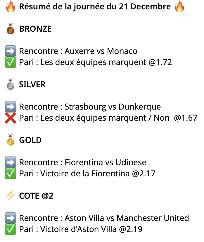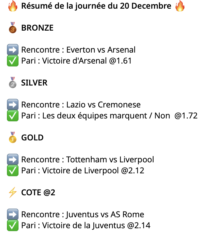 Une partie de nos pronostics est disponible gratuitement sur notre canal Telegram. Pour accéder à des analyses plus détaillées et à des conseils exclusifs, nous proposons également une offre premium.